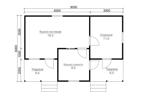 Деревянный дом общей площадью 38.3 кв.м. и размером 6х9 м. обеспечит потребности семьи из нескольких человек.