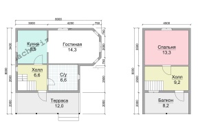 Деревянный дом общей площадью 58.5 кв.м. и размером 8х8 м. обеспечит потребности семьи из нескольких человек.