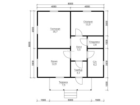 Деревянный дом общей площадью 65.9 кв.м. и размером 8х8 м. обеспечит потребности семьи из нескольких человек.