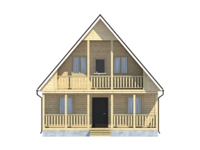 Проект полутораэтажного дома из бруса с балконом и большой террасой – востребованный вариант коттеджа для загородного проживания.
