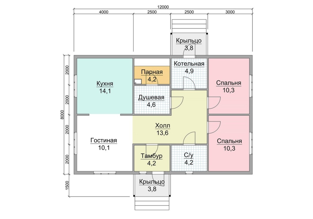Деревянный дом общей площадью 88 кв.м. и размером 8х12 м. обеспечит потребности семьи из нескольких человек.