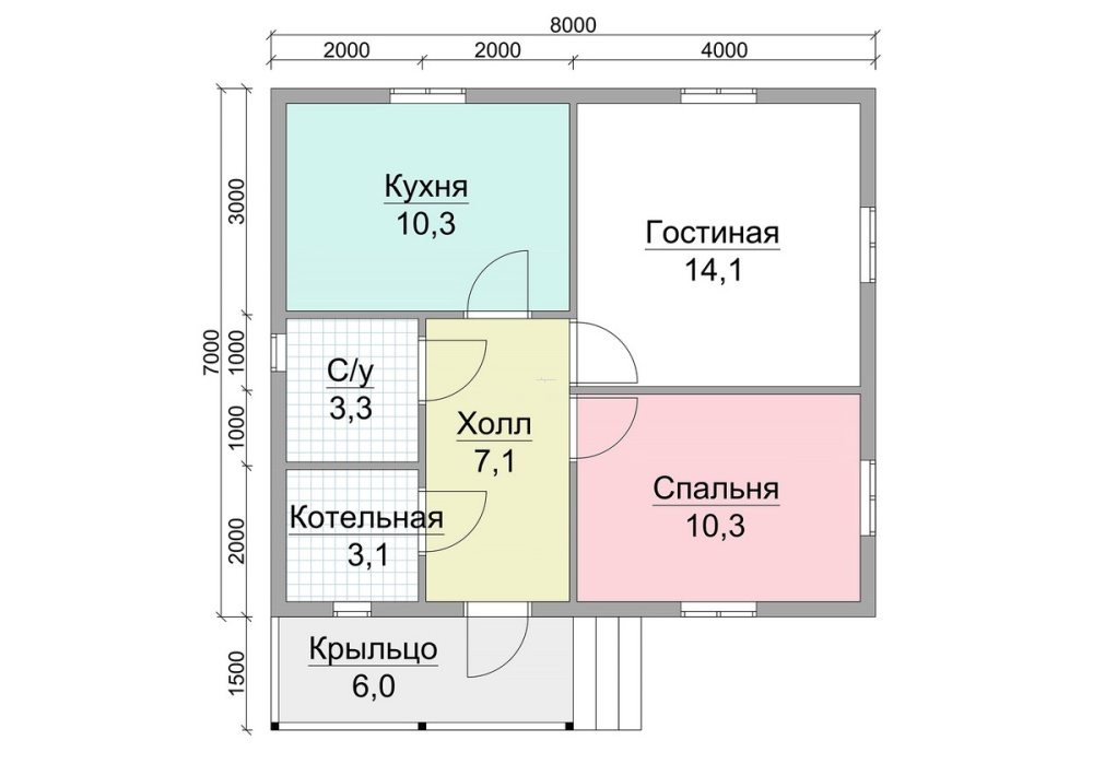 Деревянный дом общей площадью 50 кв.м. и размером 7х8 м. обеспечит потребности семьи из нескольких человек.