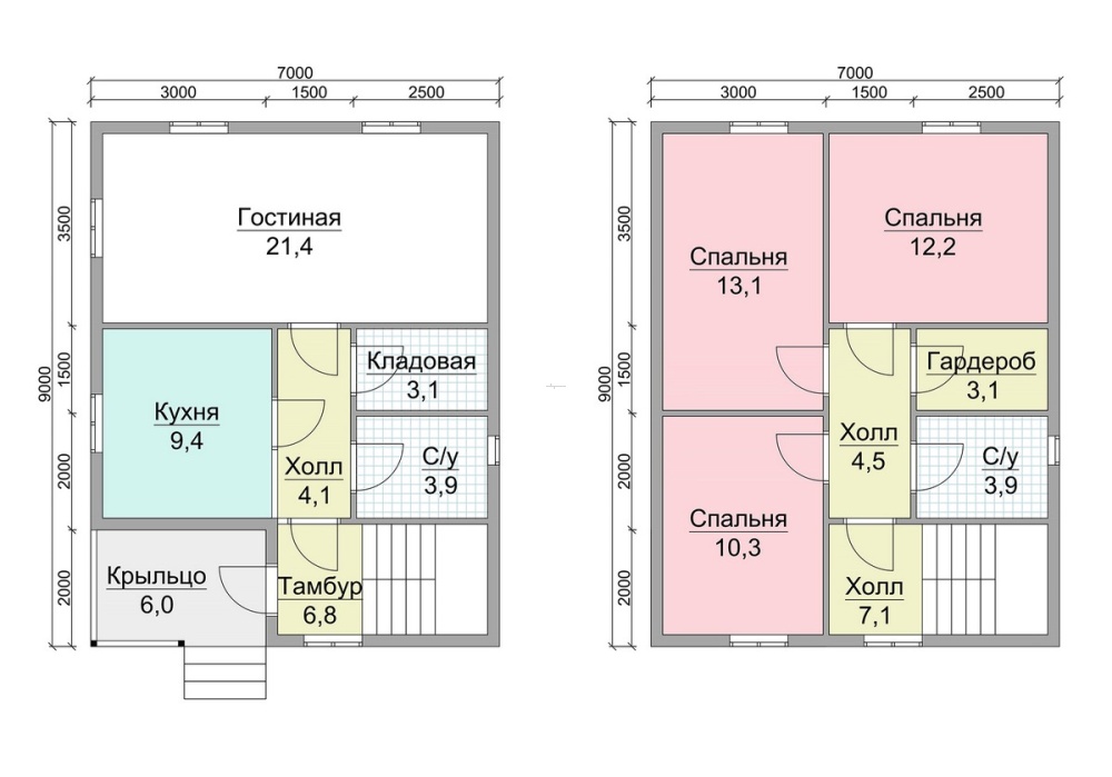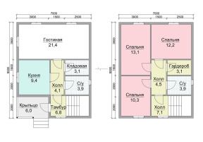 Деревянный дом общей площадью 120 кв.м. и размером 7х9 м. обеспечит потребности семьи из нескольких человек.