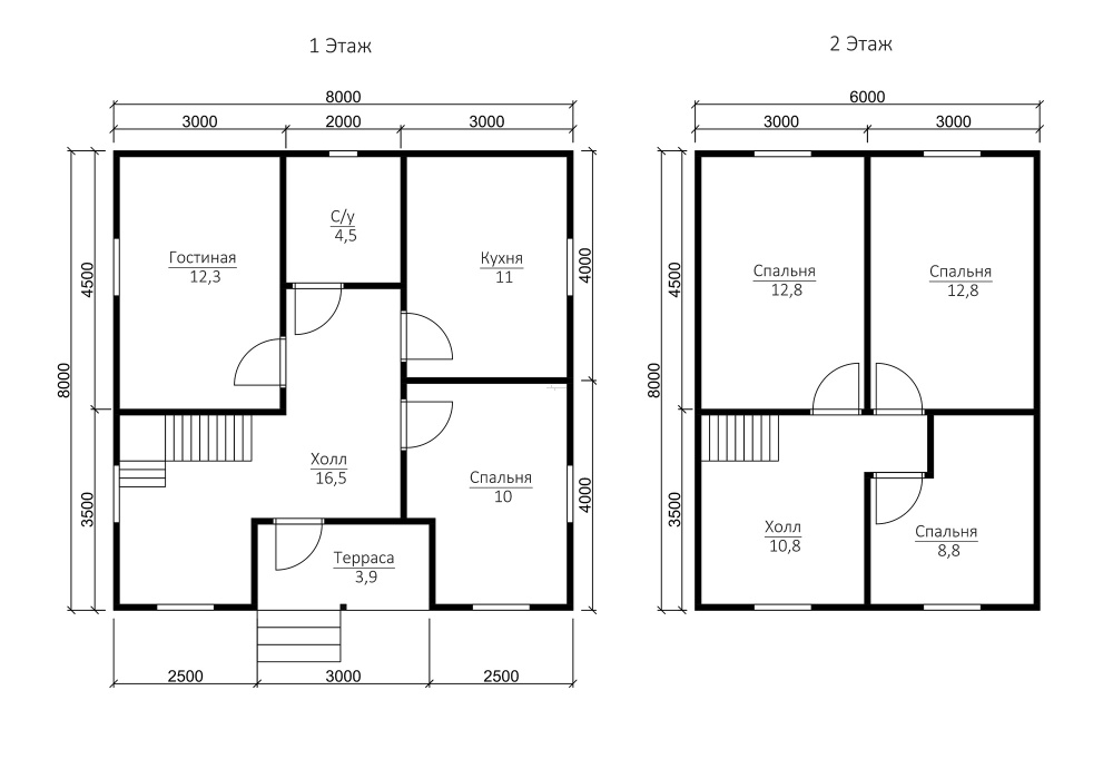 Общая площадь застройки составляет 100 кв.м., размер дома – 8х8 м..