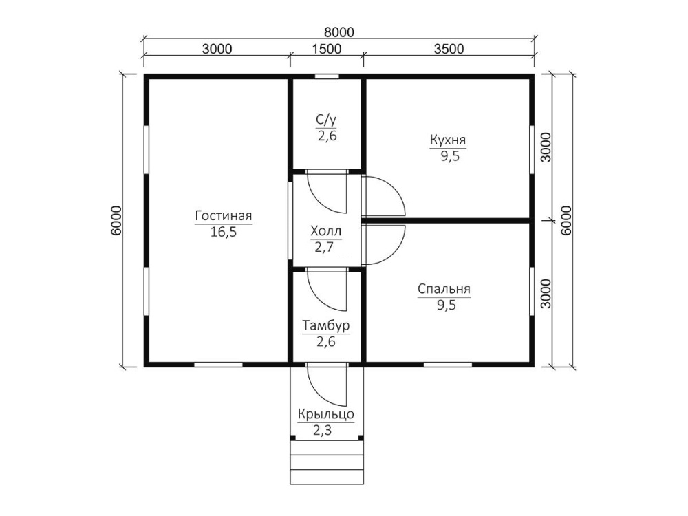 Общая площадь застройки составляет кв.м., размер дома – 6х8 м..