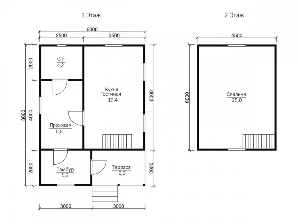 Общая площадь застройки составляет 64.3 кв.м., размер дома – 6х8 м..