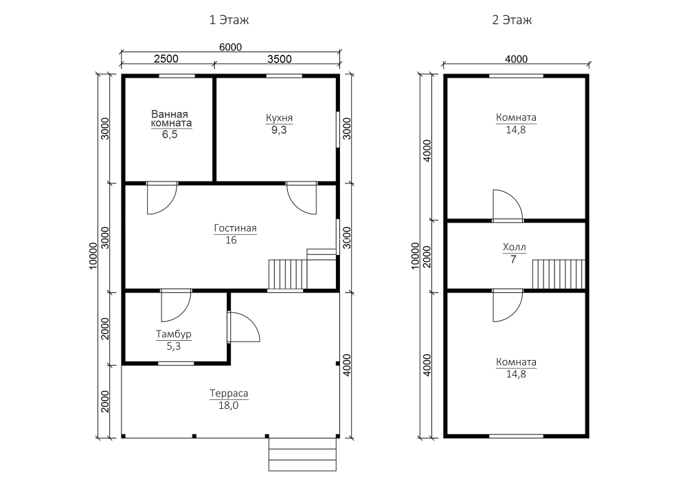 Общая площадь застройки составляет 75 кв.м., размер дома – 6х10 м..
