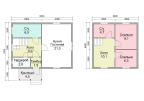 Общая площадь застройки составляет 71.6 кв.м., размер дома – 6х8 м..