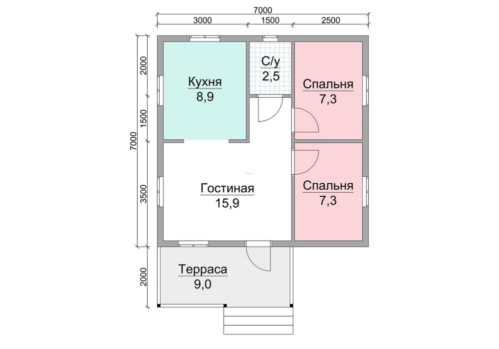 Общая площадь застройки составляет 44 кв.м., размер дома – 7х7 м..